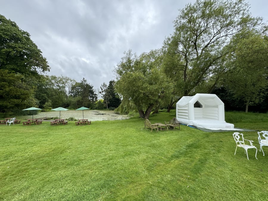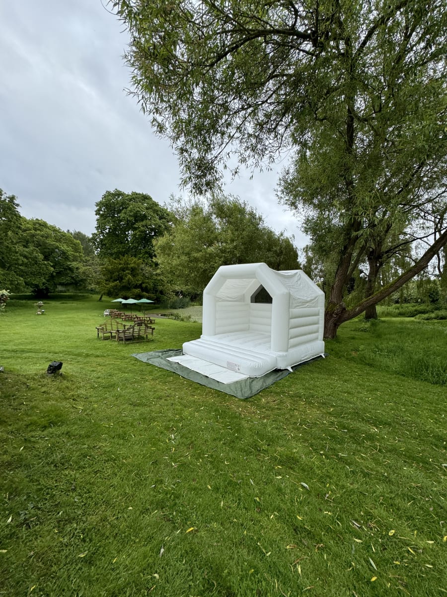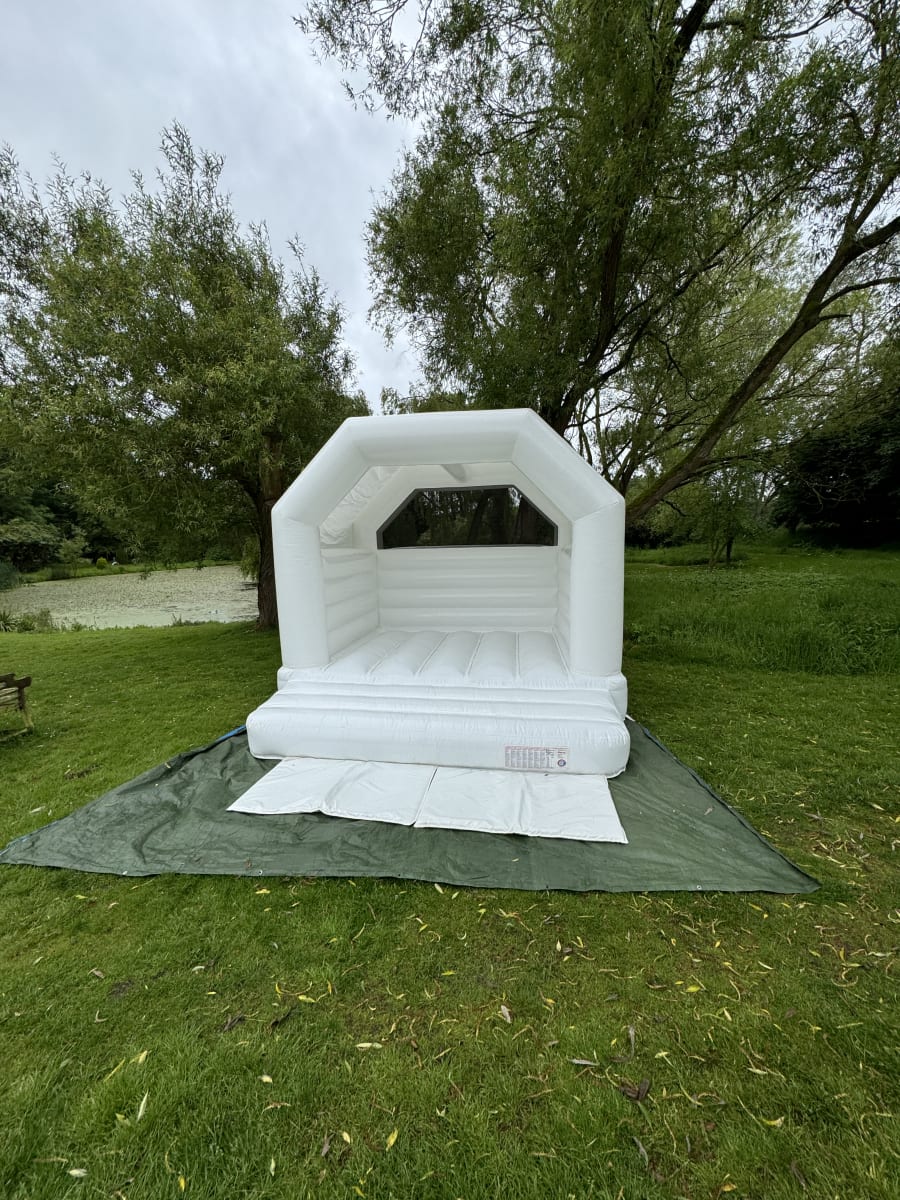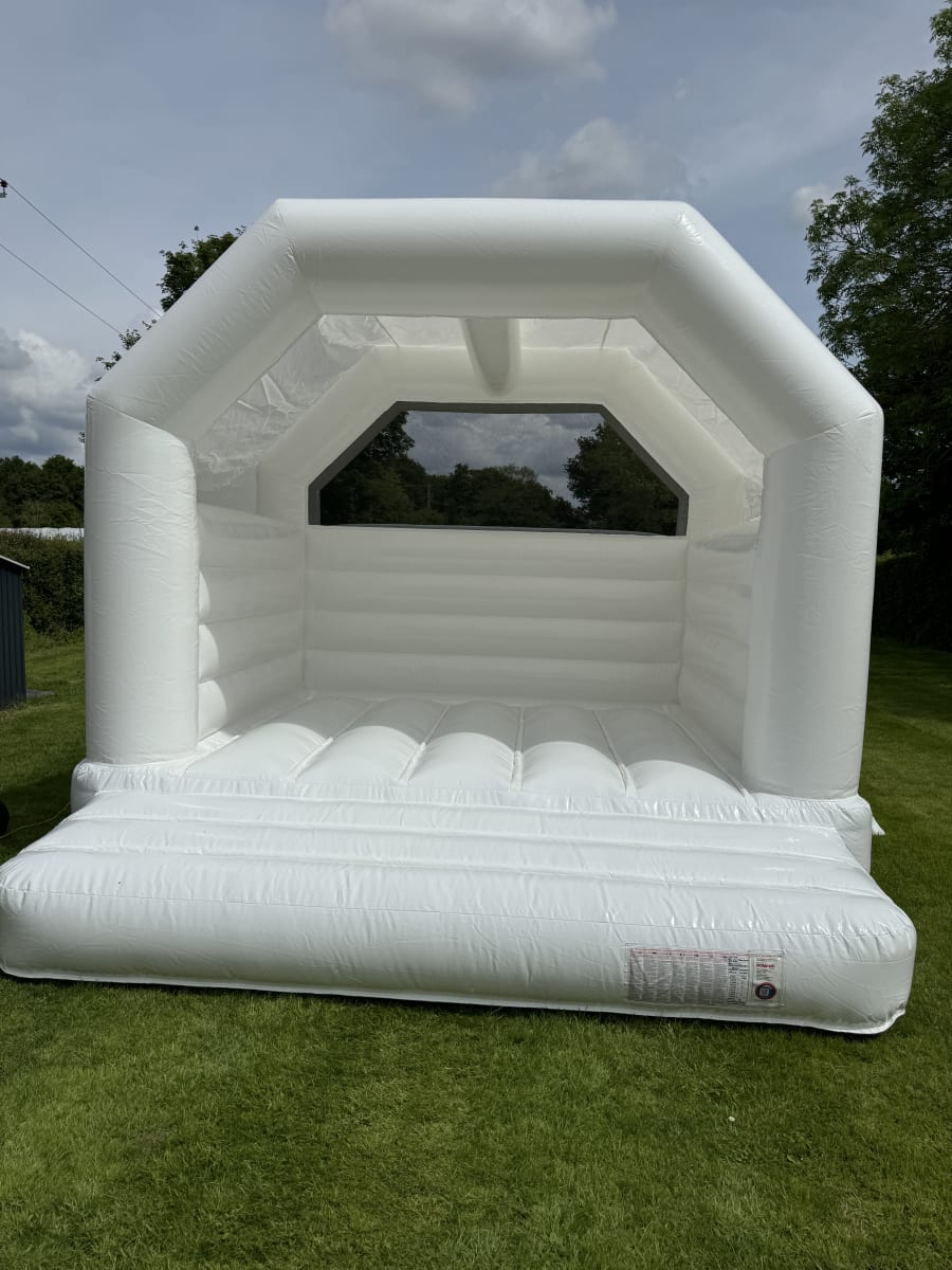 This white gloss bouncy castle has a built in rain cover to keep it dry.